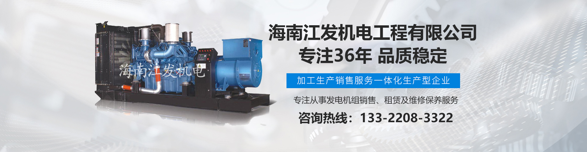 海南江發(fā)機(jī)電工程有限公司是海南經(jīng)營(yíng)進(jìn)口、國(guó)產(chǎn)柴油發(fā)電機(jī)組、是海南較早、較大的銷(xiāo)售、租賃服務(wù)及維修保養(yǎng)專(zhuān)業(yè)機(jī)電公司。從1985年開(kāi)始,公司勵(lì)精圖治、銳意進(jìn)取、不斷創(chuàng)新,不僅在海南機(jī)電行業(yè)領(lǐng)域中具有先進(jìn)技術(shù)、完美管理、誠(chéng)信服務(wù),高超的產(chǎn)品質(zhì)量和性能,而且還有合理的產(chǎn)品性能價(jià)格比,令客戶滿意以及完善的支持保障。 在客戶心目中,江發(fā)公司不僅具有最好的企業(yè)信譽(yù),還是客戶最信賴(lài)的誠(chéng)信單位,而且會(huì)帶給客戶永遠(yuǎn)的光明和豐厚回報(bào)。